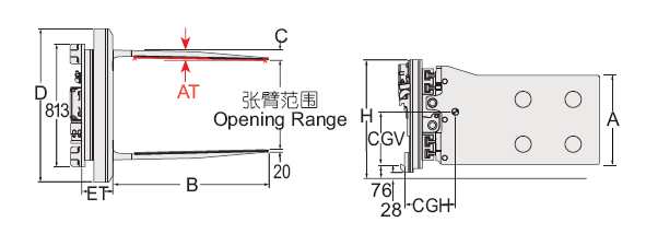 Capacity 承載能力(kg)Catalog Order NO 型號(hào)Mounting Class 安裝等級(jí) Opening Range張臂范圍(mm)Arm Height臂高A(mm)Arm Length臂長(zhǎng)B(mm)Arm Thickness臂厚C(mm)Overall Height總高H(mm)Frame Width 框架寬度D(mm)Arm Toe in內(nèi)扣量AT(見(jiàn)注5)(mm)Weight 自重(kg)Effective 失載距ET(mm)Horizontal Center of Gravity 水平重心CGH(mm)