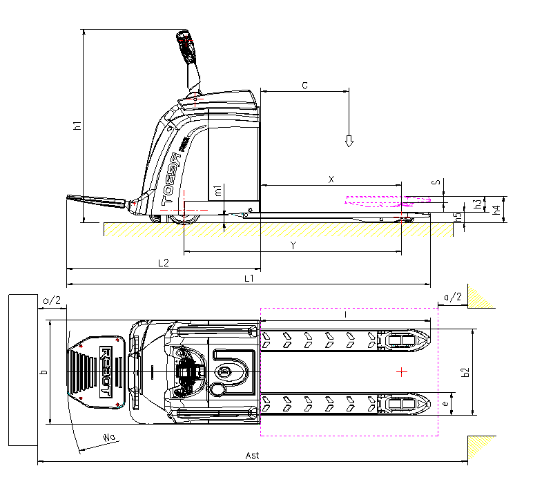| 直角堆垛通道寬度,托盤1000x1200(1000沿貨叉邊) | Ast mm | 2665 | |||